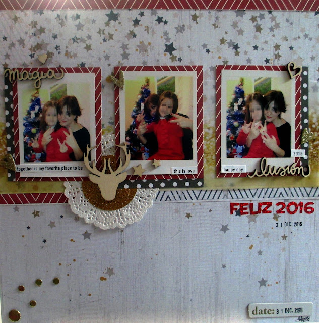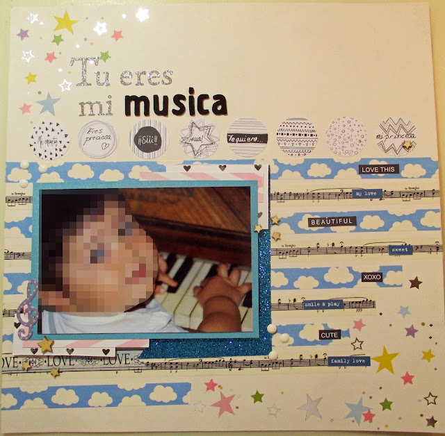 Aquí estoy con otro LO, hacía tiempo que quería hacer algo con esta foto de mi pequeña tocando el piano, y me dió la idea cuando vi el reto que este mes proponia el blog de Anita y su mundo : temática libre y lo dos requisitos que ponen es usar pegatinas y washi tapes y la segunda es seguir el esquema preparado por Mireia Sala.